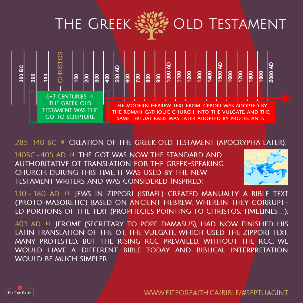 Rediscover the Bible IESOUS read and quoted from. Our Hebrew Old Testament (Masoretic) texts are 99% identical with the Greek Old Testament (5 books of the Septuagint + 17 Other OT Books) texts, but suffered some retroactive, punctual and decisive manipulations - e.g. the watering down of prophecies about IESOUS CHRISTOS being the MESSIAH, and the falsification of 64% of the begetting ages in the genealogies that form the sole basis for the date of creation.