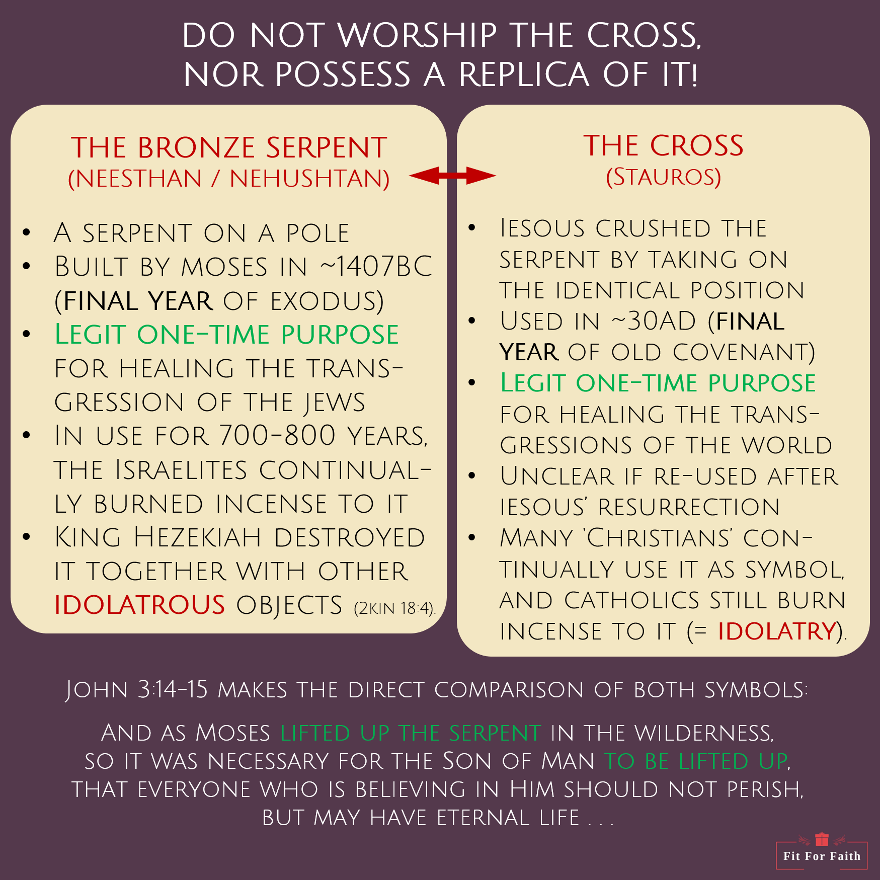If you would worship the cross, you could as well worship the serpent. Salvation came through symbols of evil (the snake in the Old Testament and the cross in the New Testament), but a worship of those means is evil in itself. If IESOUS' cross would still exist today, many would certainly worship it, and we are no better when we worship replicas of it in our churches, homes and even cars. Never worship the means of salvation, but the giver of salvation!